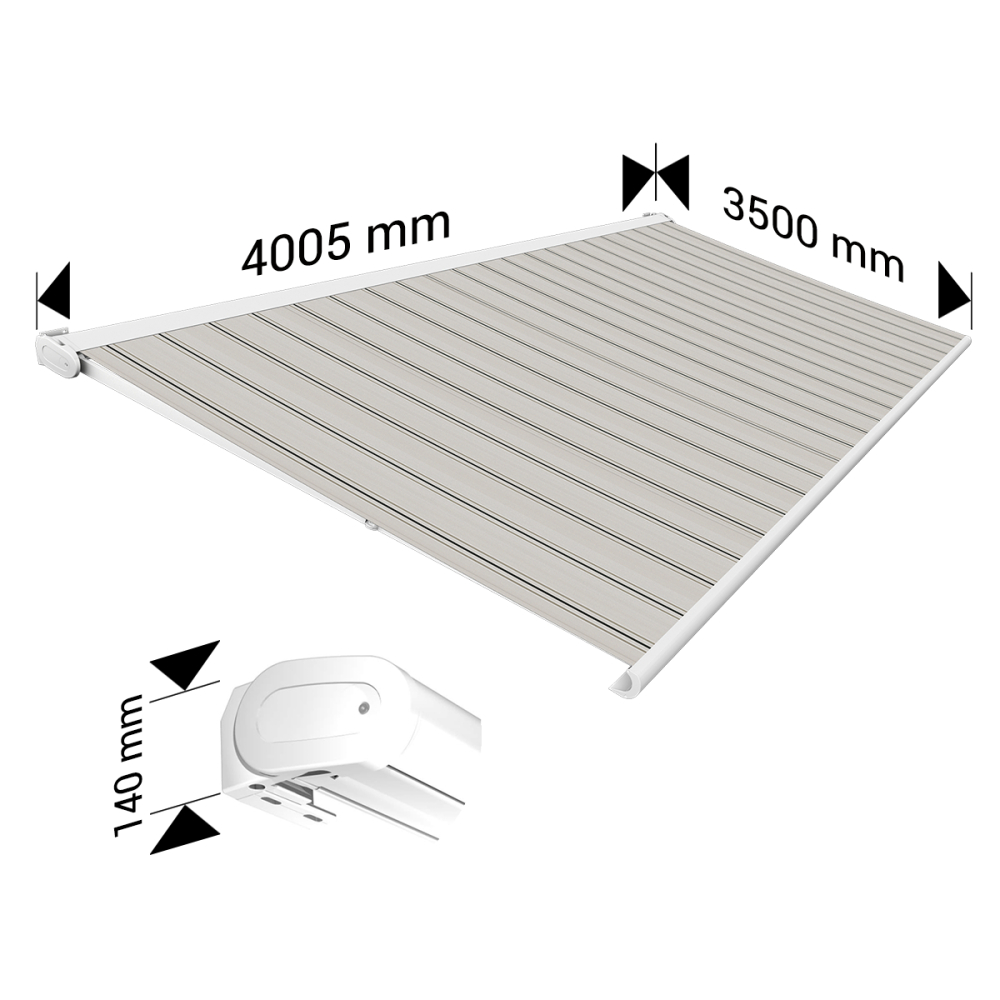 Store banne Coffre intégral PROTECT 2 LED Blanc 4,05x3,50m Motorisé à télécommande + Eclairage LED - Toile Grise Rayée