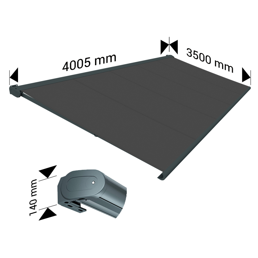 Store banne Coffre intégral PROTECT 2 LED SMART Gris Anthracite 4,05x3,50m Motorisé à télécommande + Capteur Vent + Eclairage LED - Toile Grise Anthracite