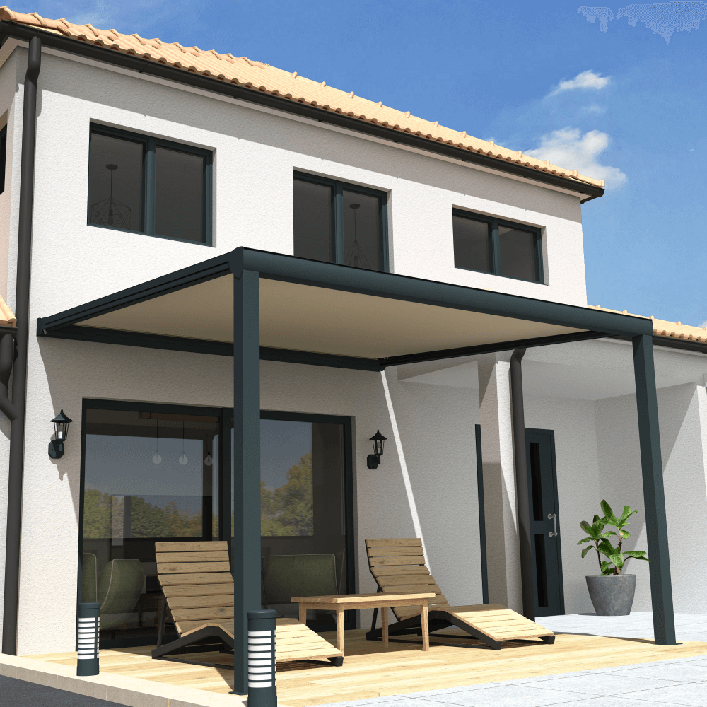 Légère de par sa conception en aluminium, vous pourrez la mettre en place facilement : livrée en kit, tout est détaillée dans la notice fournie pour une installation facile et rapide. L’aluminium est un matériau de fabrication robuste, non corrosif, léger et design. En plus d’apporter les performances techniques à votre pergola toile, il assurera l’esthétisme du rendu que vous possédiez une maison dans le style traditionnel ou moderne. La couleur gris anthracite de la structure s’accorde avec tout.